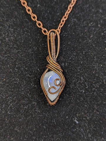 Handgemaakte ketting met een prachtige regenboog maansteen in koper. De hanger is 42 x 13 mm.