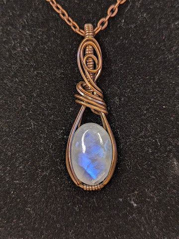 Handgemaakte ketting met een prachtige regenboog maansteen in koper. De hanger is 52 x 14 mm.