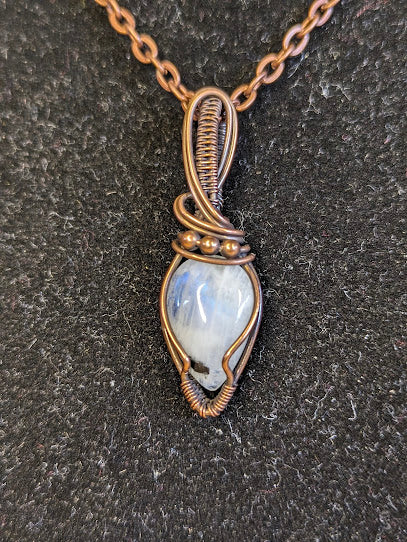 Handgemaakte ketting met een prachtige regenboog maansteen in koper. De hanger is 40 x 12 mm.