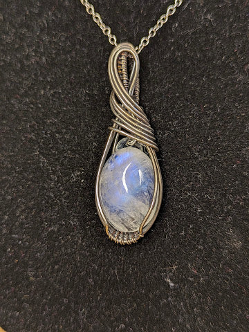 Handgemaakte ketting met een prachtige regenboog maansteen in zilver. De hanger is 45 x 15 mm.