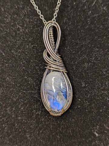 Handgemaakte ketting met een prachtige regenboog maansteen in zilver. De hanger is 43 x 14 mm.