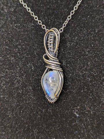 Handgemaakte ketting met een prachtige regenboog maansteen in zilver. De hanger is 33 x 10 mm.